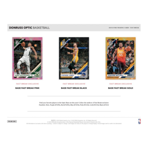 Find your favorite players in the Optic Base set this year! Collect the rainbow of Fast Break-exclusive Parallels: Holo, Purple (#’d/95), Red (#’d/85), Blue (#’d/50), Pink (#’d/20), Gold (#’d/10), Black (#’d/1)!