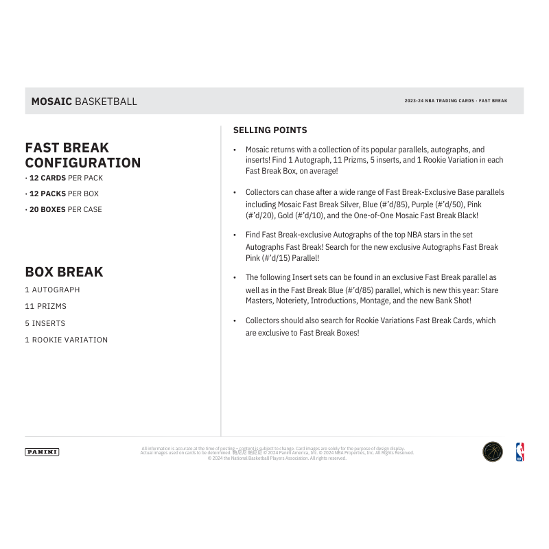 - Mosaic returns with a collection of its popular parallels, autographs, and inserts! Find 1 Autograph, 11 Prizms, 5 inserts, and 1 Rookie Variation in each Fast Break Box, on average!