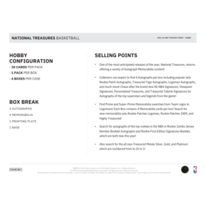 The 2023/24 Panini National Treasures Basketball Hobby Box offers collectors the pinnacle of premium basketball cards. Each box delivers 10 high-end cards, including four autographs and four memorabilia cards, featuring some of the most sought-after rookies, veterans, and legends in the game. Look out for the iconic Rookie Patch Autographs, featuring on-card signatures paired with stunning multi-color patches. Chase ultra-rare inserts like Treasured Tags and Logoman cards, as well as unique booklets and personalized inscriptions. National Treasures combines unparalleled craftsmanship and exclusivity, making it a must-have for serious collectors and basketball fans alike.