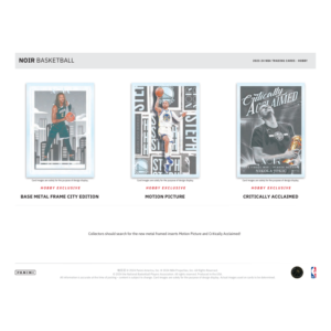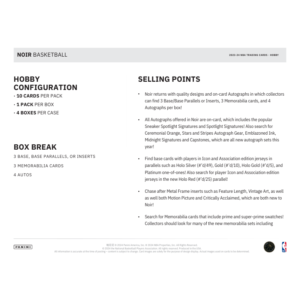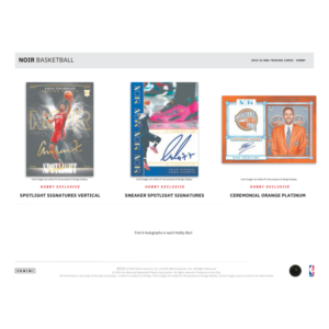 - Noir returns with quality designs and on-card Autographs in which collectors can find 3 Base/Base Parallels or Inserts, 3 Memorabilia cards, and 4 Autographs per box!