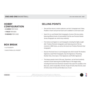 The 2023/24 Panini One & One Basketball Hobby Box brings elite-level collecting to NBA fans with a beautifully curated set focused on premium design and quality. Each box delivers two encapsulated cards: one autograph and one base, parallel, or insert, ensuring every pull is both special and valuable. With on-card autographs from top rookies, current stars, and NBA legends, this set also includes stunning inserts like Timeless Moments, capturing iconic plays, and Downtown, featuring artistic depictions of players and their cities.