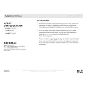 The 2023 Panini Flawless Football Hobby 2 Box Case is the pinnacle of high-end football card collecting, featuring some of the most premium cards in the hobby. Known for its luxurious presentation and ultra-rare content, each box offers a lineup of on-card autographs, multi-color patches, and genuine gemstone-embedded cards, highlighting the NFL’s biggest stars, top rookies, and Hall of Famers. With stunning designs and limited-edition cards, Flawless delivers unparalleled quality and exclusivity, including game-worn memorabilia and low-numbered parallels. Perfect for collectors looking for the best of the best, this 2 Box Case is the ultimate addition to any elite football card collection.