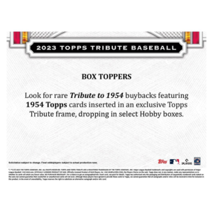– Look for rare Tribute to 1954 buybacks featuring 1954 Topps cards inserted in an exclusive Topps Tribute frame, dropping in select Hobby boxes.