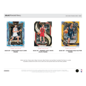 The 2024/25 Panini Select Basketball Hobby 12 Box Case kicks off the season with a high-end chrome-loaded experience designed for serious collectors. Each case contains 12 boxes with 12 packs of 5 cards each, delivering an average of three autographs or memorabilia cards, twelve base Prizm parallels, and three inserts or insert‑parallels . Collectors can chase the tiered base set—Concourse, Premier Level, and Courtside—alongside hobby-exclusive parallels like Tie‑Dye (/25), Gold (/10), Green (/5), Zebra, Gold Glitter, and ultra‑rare Black Finite (1/1) . Mid- and high-end chase content includes vibrant hobby-only inserts such as En Fuego, Select Future, Clutch, Score Select Throwback, Sky High, as well as sought-after short-printed case hits like Color Wheel, Visionary, and the new Solar Eclipse .