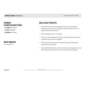 The 2024 Panini Impeccable Baseball Hobby Case offers a high-end collecting experience, perfect for those looking for premium hits and exceptional design. Each box contains on-card autographs, stunning patch cards, and elegant metal inserts, featuring some of baseball’s biggest stars, legends, and top rookies. With a variety of limited-edition parallels and multi-signed cards, the 2024 Impeccable Baseball 3 Box Case is a must-have for serious collectors who appreciate both quality and rarity in their collections.