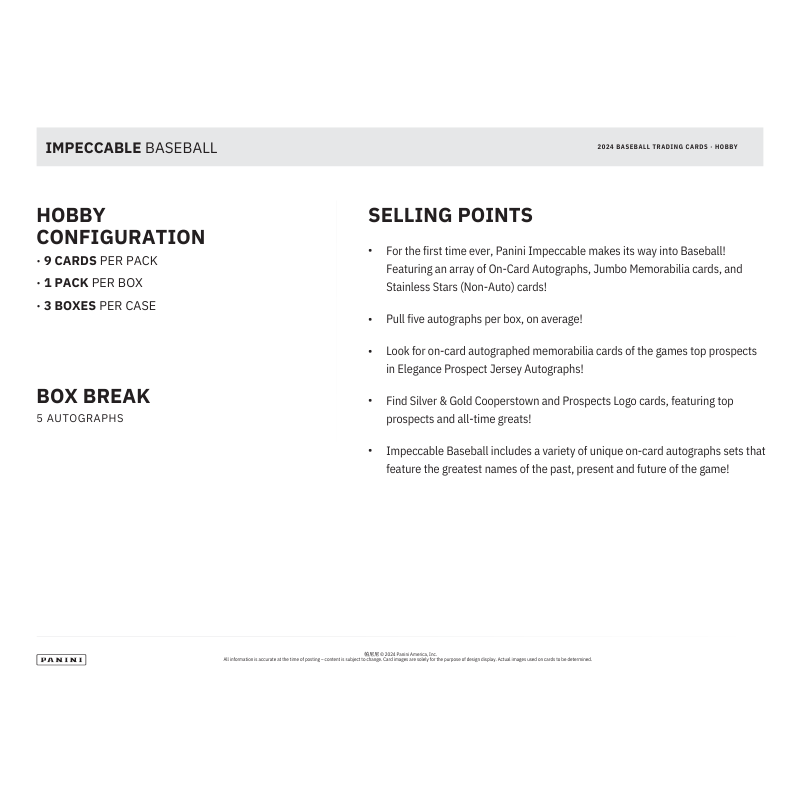 - For the first time ever, Panini Impeccable makes its way into Baseball! Featuring an array of On-Card Autographs, Jumbo Memorabilia cards, and Stainless Stars (Non-Auto) cards!
