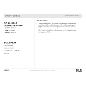 The 2024 Panini Mosaic Football No Huddle 20 Box Case delivers a vibrant and collectible experience for football fans, featuring exclusive No Huddle parallels and inserts. Each box includes 12 packs with 12 cards per pack, offering a mix of stunning base cards, sought-after parallels, and rare inserts. Look for autographs from NFL stars and rookies, along with exclusive Disco variations unique to this format. With its bold Mosaic designs and chase-worthy hits, this case is perfect for collectors looking to add high-quality football cards to their collection.