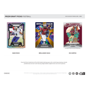 •  Prizm Draft Picks Football kicks off the 2024 football collecting season with a colorful bang, boasting a vibrantly paralleled base and insert roster featuring college football’s brightest former and current superstars.
