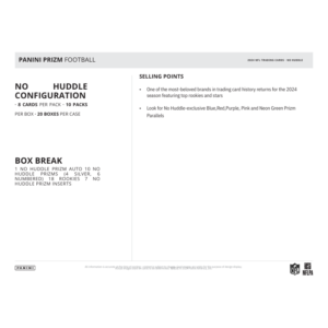 – Find No Huddle-exclusive Base and Rookie Prizm Parallels Blue, Red, Purple, Pink, Neon Green, from the hottest rookies of the 2024 Rookie Class!