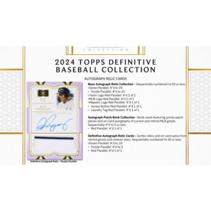 • 2024 Topps Definitive Baseball features on-card autographs, oversized uniform patches, unique memorabilia pieces, and more from the leading names in the sport.