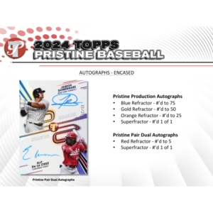 The 2024 Topps Pristine Baseball Hobby Box is a premium experience for collectors who crave excitement. This set brings together the finest elements of the Topps brand, offering a unique combination of pristine base cards, stunning inserts, and on-card autographs. Whether you’re chasing rare autographs or adding to your collection of top-tier players, the 2024 Topps Pristine Baseball Hobby Box is a must-have for any baseball enthusiast.