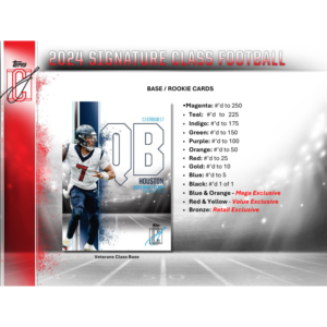 The 2024 Topps Signature Class Football Hobby Box delivers a premium collecting experience, featuring on-card autographs and a refined checklist of top NFL stars, legends, and promising rookies. Each hobby box includes 1 encased autograph card, showcasing crisp signatures and sleek card designs that highlight the player’s legacy and impact. Collectors can look forward to low-numbered parallels, rare inserts, and potential hits from both current greats and Hall of Famers. With its focus on quality over quantity, Signature Class is perfect for collectors seeking standout autographs and elegant football card presentation.