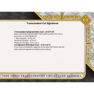 • With careful crafting and elegant touches, 2024 Topps Transcendent Baseball provides the most premium trading card experience with all-new adjustments and chase added across the entire release!