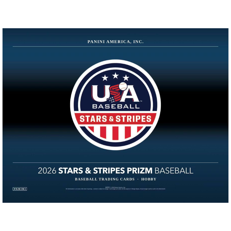The 2026 Panini USA Stars & Stripes Prizm Baseball Hobby 12 Box Case marks the first time the popular USA Baseball Stars & Stripes program receives the full Prizm treatment, combining Panini’s iconic chromium design with the top prospects and alumni from USA Baseball. Within the case, each hobby box contains 12 packs with 12 cards per pack and delivers six autographs or memorabilia cards on average, along with 18 Prizm parallels and 12 inserts or insert parallels.